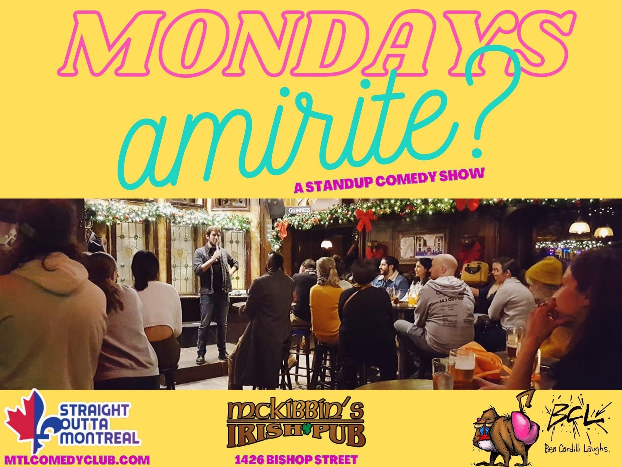 Straight Outta Montreal, and Ben Cardilli present Mondays Amirite? a weekly booked open mic on Mondays at McKibbin’s Irish Pub on Bishop Street in Downtown Montreal.