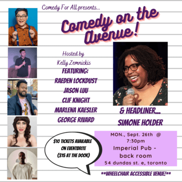 Join us on Monday, Sept 26th at 7:30pm at Toronto’s famed Imperial Pub for a night of laughs that everyone can enjoy… because it’s comedy in a wheelchair accessible space, yo!!